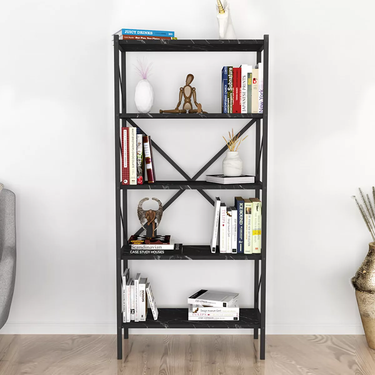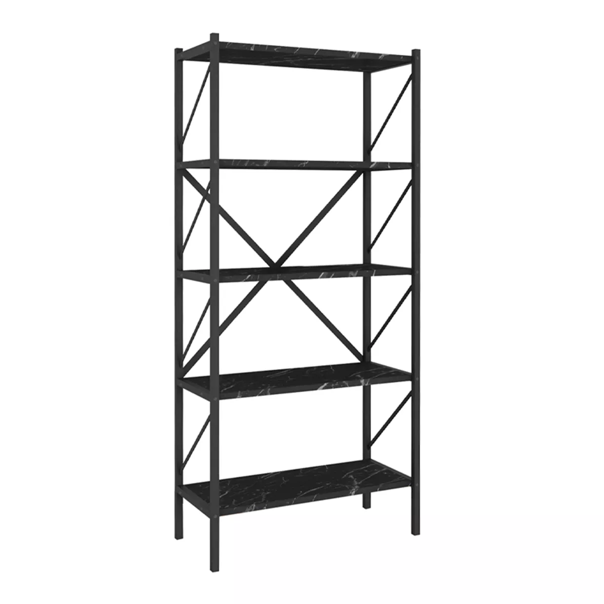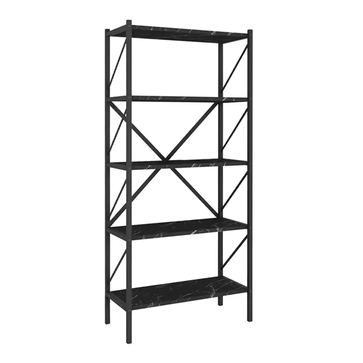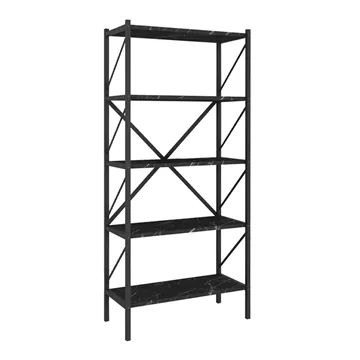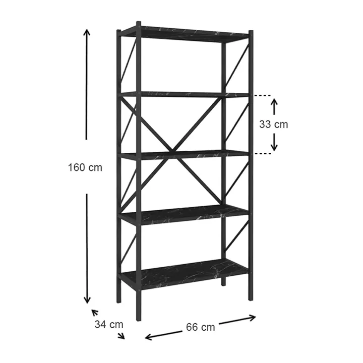 Βιβλιοθήκη Jocasta Megapap μεταλλική - μελαμίνης χρώμα μαύρο εφέ μαρμάρου 66x34x160εκ.