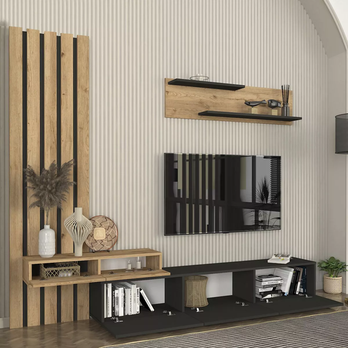 Σύνθεση τηλεόρασης Rosaline Megapap χρώμα ανθρακί - sepet oak 233x31,3x196,8εκ.