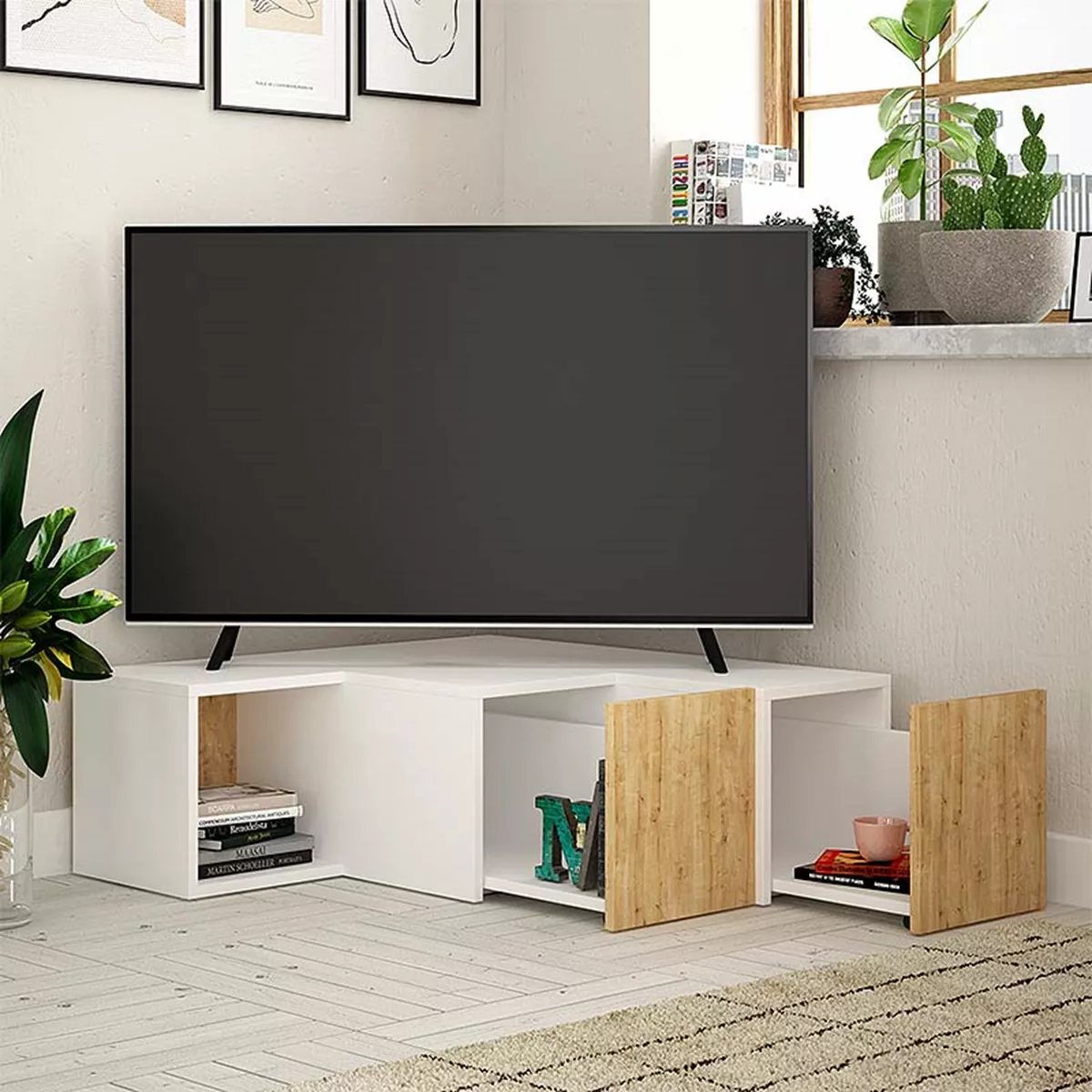 Έπιπλο τηλεόρασης γωνιακό Compact Megapap μελαμίνης χρώμα λευκό - φυσικό οξιάς 94,2x90,6x31,4εκ.