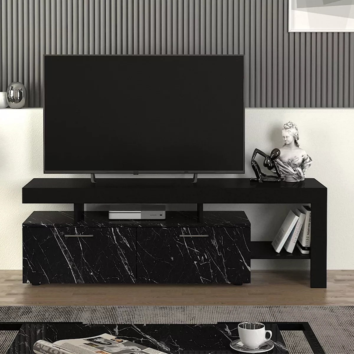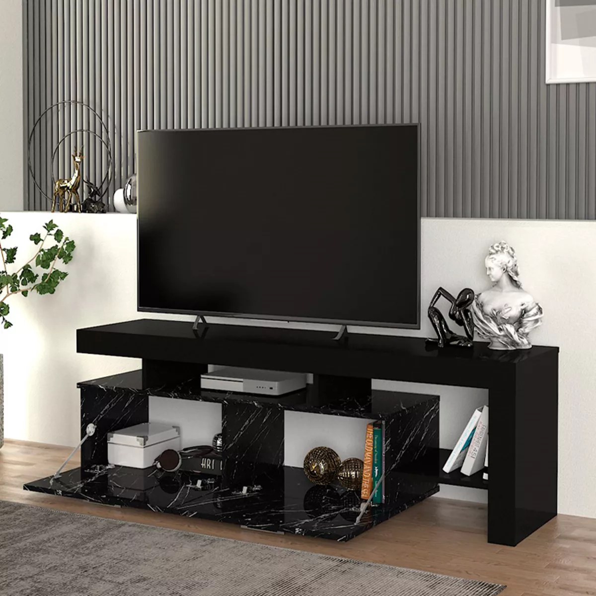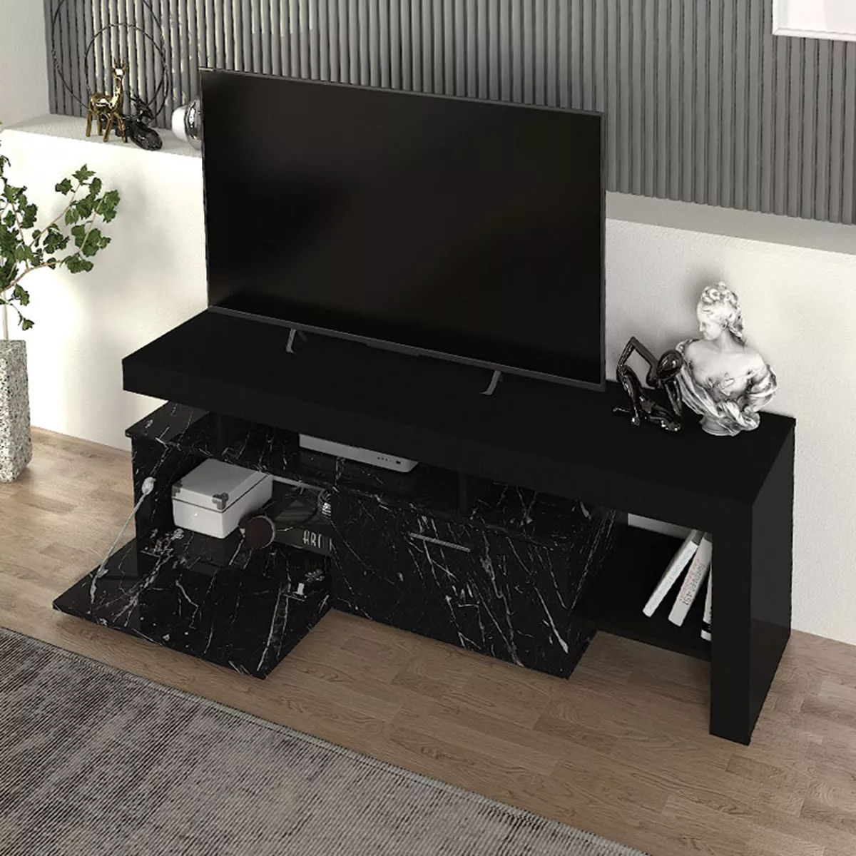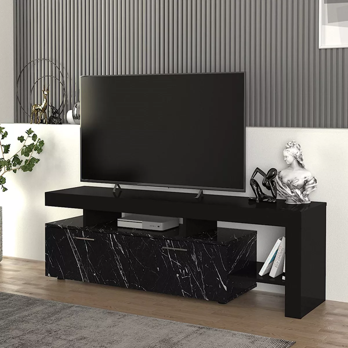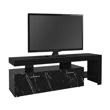 Έπιπλο τηλεόρασης Acnes Megapap χρώμα μαύρο - μαύρο εφέ μαρμάρου 160x40x53εκ.