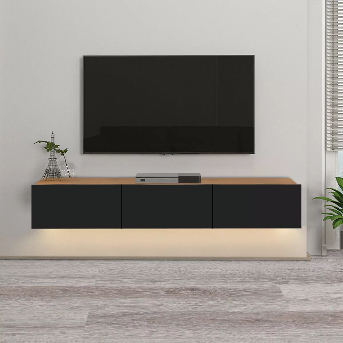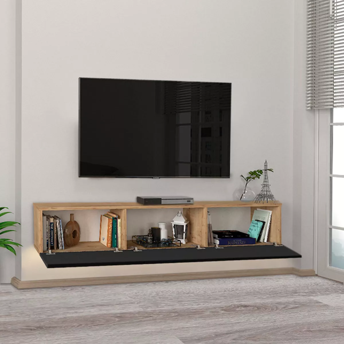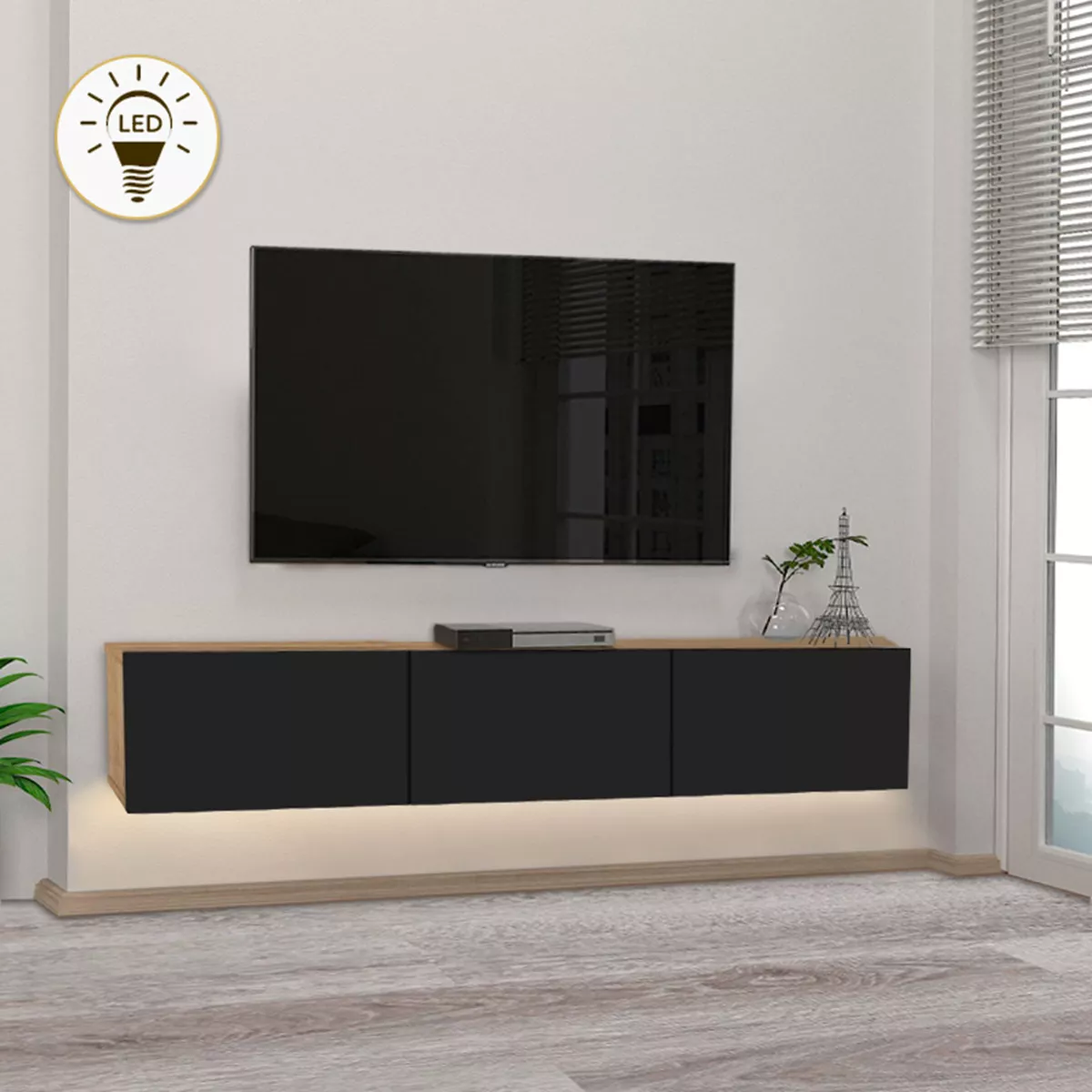 Έπιπλο τηλεόρασης επιτοίχιο Damla Megapap με LED χρώμα sapphire oak - μαύρο 180x29,5x29,5εκ.