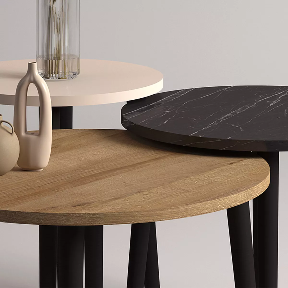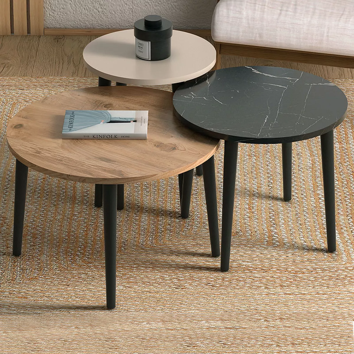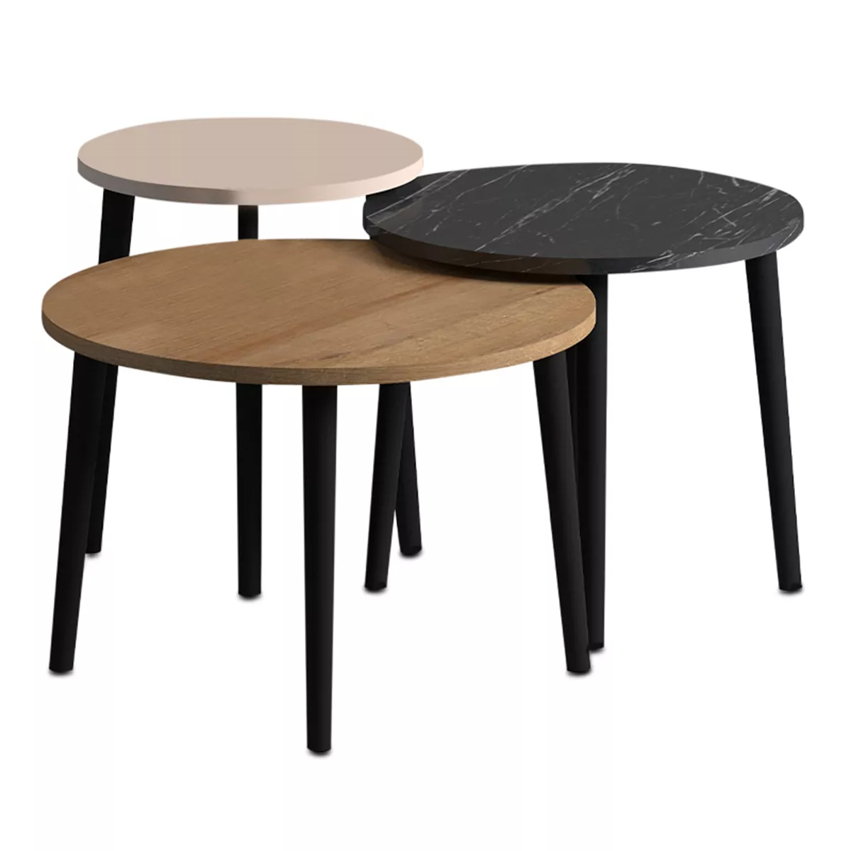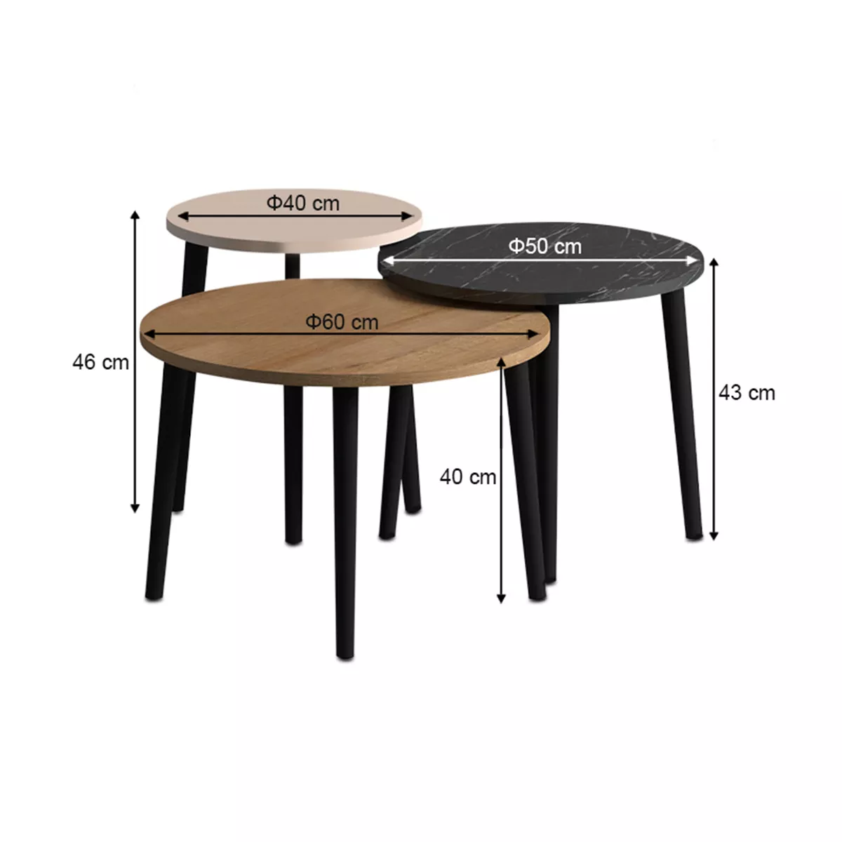 Τραπεζάκι σαλονιού σετ 3 τμχ Roma Megapap χρώμα oak - μαύρο εφέ μαρμάρου - κρεμ Φ60x46εκ.