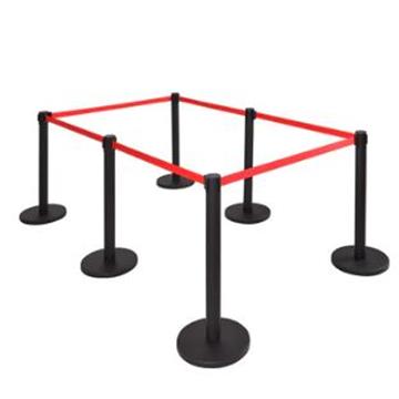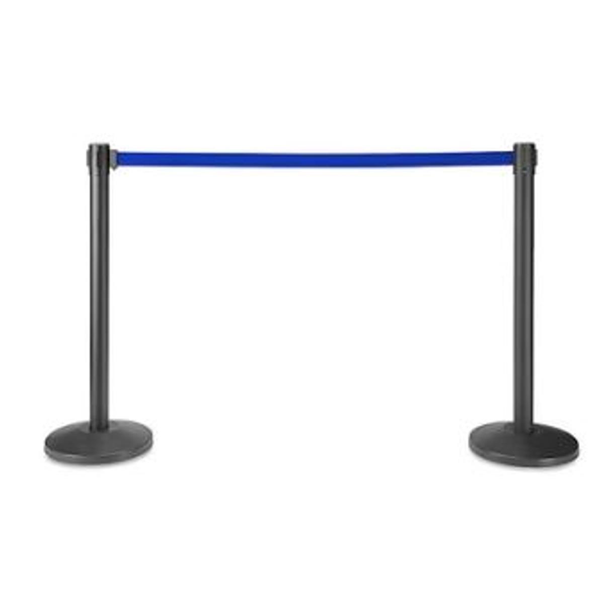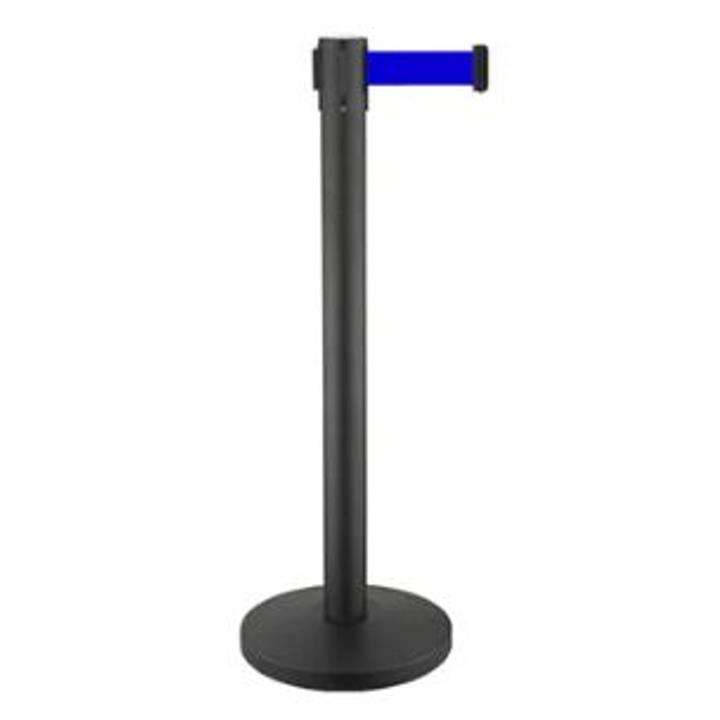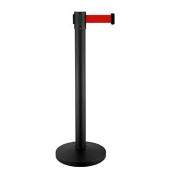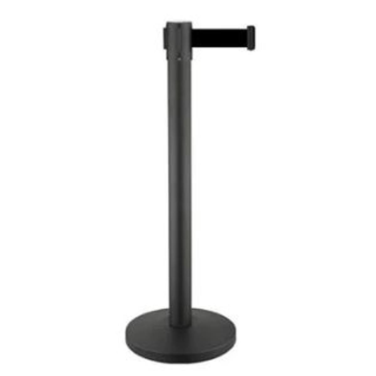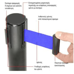 Κολωνάκι οριοθέτησης χώρου διαμέτρου 63 mm ύψους 910 mm κατασκευασμένο από χαλυβδοσωλήνα βαμμένο σε μαύρο ματ χρώμα με ηλεκτροστατική βαφή. Στιβαρή βάση διαμέτρου 320 mm σε μαύρο χρώμα με ιμάντα από πολυεστερικό ύφασμα και ειδικό μηχανισμό περιέλιξης και επαναφοράς, μήκους 2m που διατίθεται σε 3 χρώματα μπλε, μαυρο και κόκκινο.