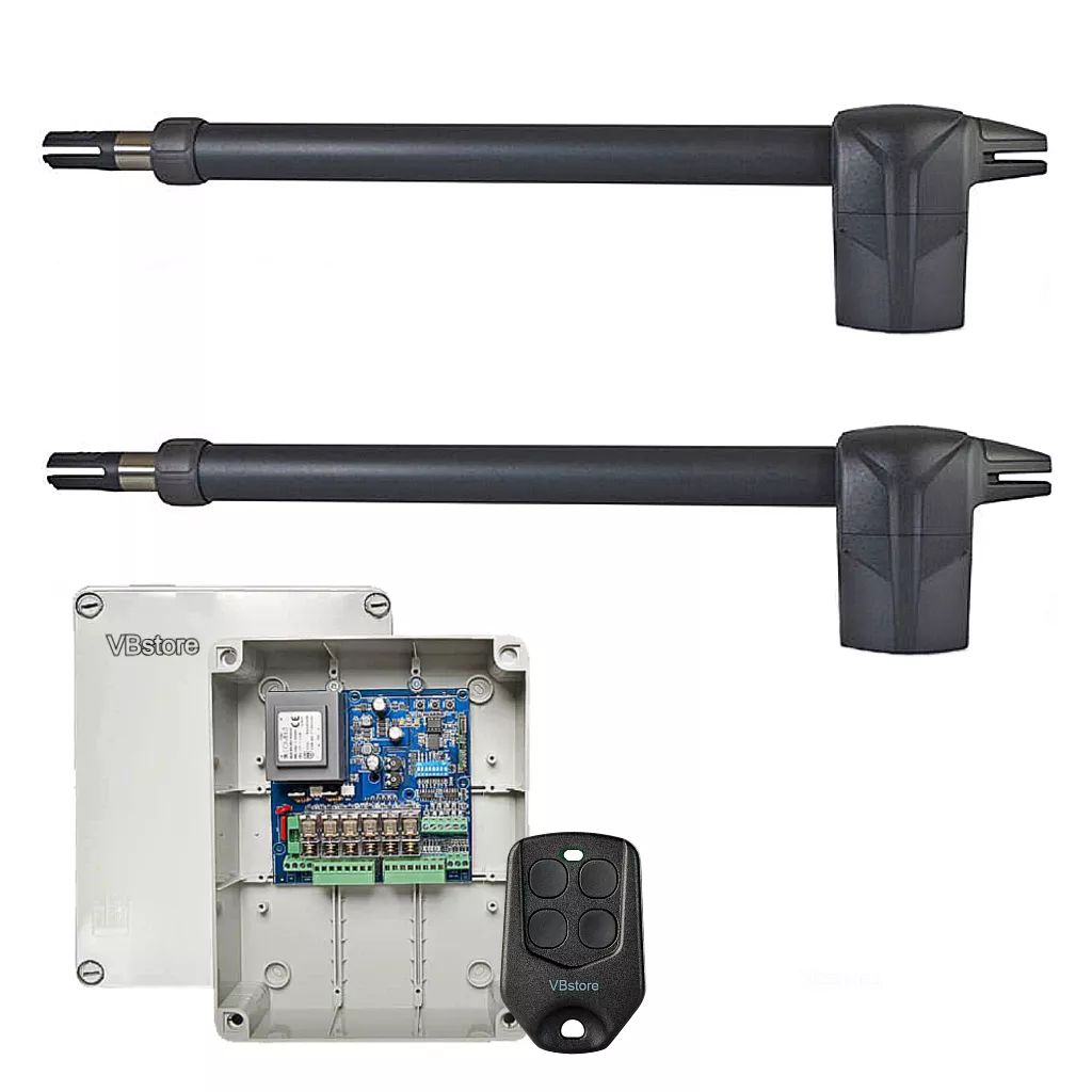 Ιταλικό σετ μοτέρ με μπράτσα 230V για δίφυλλη πόρτα έως 2,75 m ανά φύλλο και 350 kg. Ώθηση 2800 N, περίπου 22″ στα 90°, IP44. Σετ με πλακέτα ελέγχου και 1 τηλεχειριστήριο.