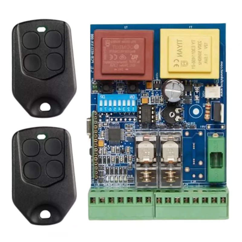 433,92MHz Κυλιόμενου κωδικού, καταχώρηση στη μνήμη έως 300 τηλεχειριστήρια, έξοδος κινητήρα έως 1200W, έξοδος για φωτοκύτταρα 24VAC, διπλό αυτόματο κλείσιμο, λειτουργία πεζού.
