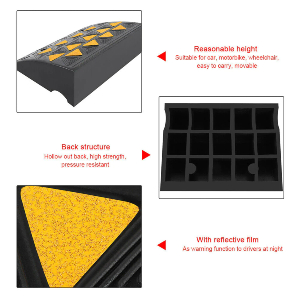 Ράμπα πεζοδρομίου από ελαστικό ύψους 15,5cm με κίτρινα ανακλαστικά. Μπορεί να καλύψει τη συνηθισμένη διαφορά ύψους του επιπέδου του δρόμου από το πεζοδρόμιο. Είναι φτιαγμένη από ένα συμπαγές κομμάτι ελαστικού κατάλληλο για φορτίο οποιουδήποτε αυτοκινήτου. Διαθέτει κίτρινα ανακλαστικά ώστε να γίνεται εύκολα ευδιάκριτη από μακριά και σε συνθήκες χαμηλού φωτισμού. Έχει αντιολισθητική χάραξη στην επιφάνειά τής για καλύτερη πρόσφυση των τροχών του αυτοκινήτου. Οι μεγάλες διαστάσεις της εξασφαλίζουν ότι ο τροχός του αυτοκινήτου θα βρεθεί εύκολα πάνω του χωρίς ιδιαίτερη προσπάθεια.Η επιφάνεια της ράμπας είναι ειδικά σχεδιασμένη για να έχει αντιολισθητική συμπεριφορά.
