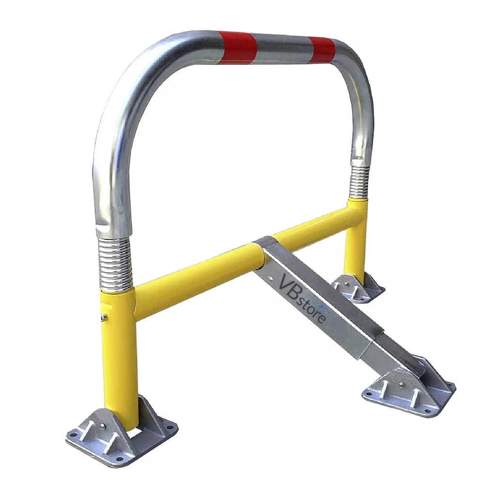 Γαλβανιζέ τρίποδη μπάρα στάθμευσης Φ55×2mm με ενσωματωμένη κλειδαριά και κλείδωμα με ένα σήκωμα. Διαθέτει 2 αντικραδασμικά ελατήρια και χυτά ποδαράκια για σταθερή στήριξη.